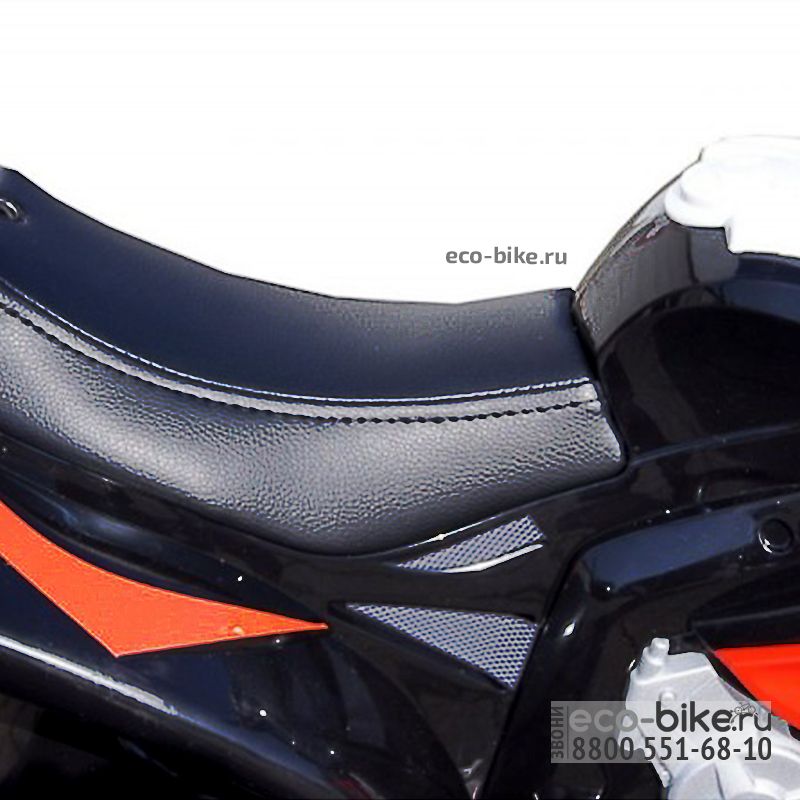 Сиденье пластмассовое. Большие, широкие и комфортные подножки. Тонированное ветровое стекло. Ребенок спокойно может забраться на мотобайк. Катание происходит от давления на педель находится по правую ногу. Управлять может, только он, т.к. пульта ДУ нет. Передние фары начинают светиться во время нажатия на педаль. Имеются и звуковые эффекты, для них нужны две батарейки AAA.